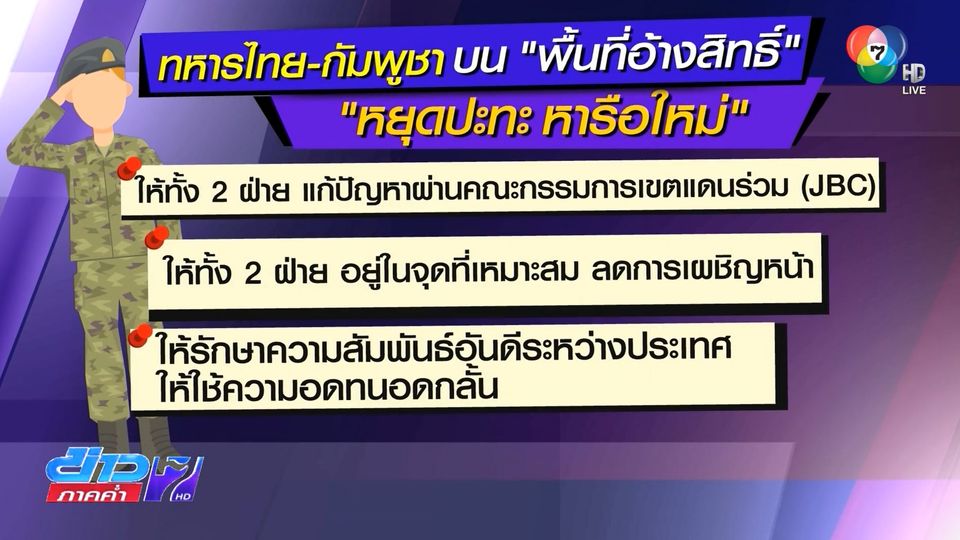ข่าวภาคค่ำ - เหตุปะทะกันระหว่างทหารไทยและกัมพูชา ช่องบก จังหวัดอุบลราชธานี ผู้บัญชาการทหารบกไทยและกัมพูชา ได้ข้อสรุปร่วมกันแล้ว ต่างถ้อยออกห่างจากพื้นที่อ้างสิทธิ์ 200 เมตร