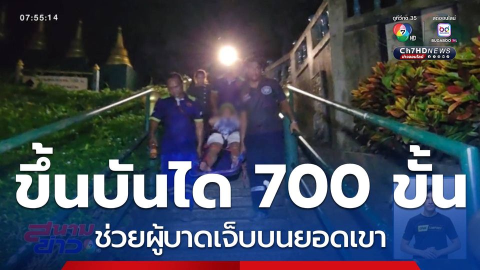 สนามข่าว 7 สี - นักท่องเที่ยวชาวต่างชาติ ลื่นล้มบาดเจ็บ บนยอดเขาสูง บริเวณวัดถ้ำเสือวิปัสสนา จังหวัดกระบี่ ซึ่งกว่าเจ้าหน้าที่กู้ภัยจะเดินขึ้นไปช่วยเหลือพาตัวลงมาด้านล่างได้ ต้องเดินบันไดขึ้นไป 700 ขั้น เพื่อหามผู้บาดเจ็บลงมา