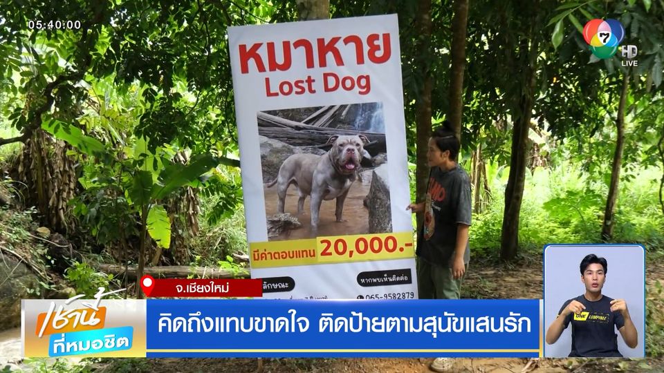 เช้านี้ที่หมอชิต - เจ้าของคิดถึงแทบขาดใจ ขึ้นป้ายตามหาสุนัขแสนรักหายตัวไป ทั่วอำเภอ ให้รางวัลคนที่พบ 20,000 บาท