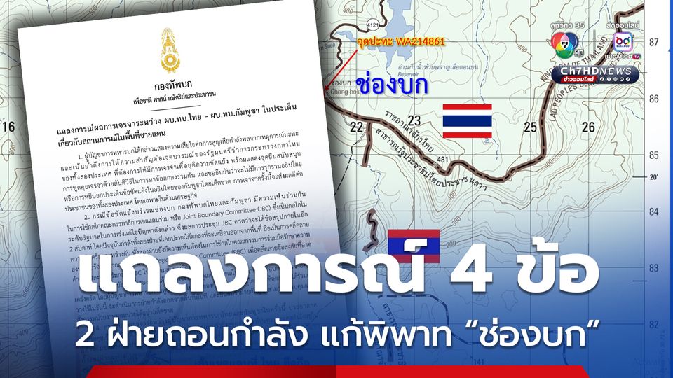 กองทัพบก ออกแถลงการณ์ 4 ข้อ ระหว่างไทย-กัมพูชา แก้พิพาท “ช่องบก” หนุนเจรจาด้วยสันติ ปกป้องอธิปไตยทุกตารางนิ้ว ยันทหาร 2 ฝ่ายถอนกำลังแล้ว