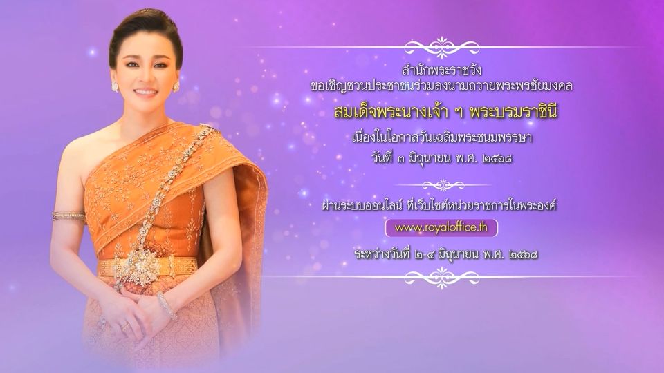 สำนักพระราชวัง ขอเชิญชวนประชาชนร่วมลงนามถวายพระพรชัยมงคล สมเด็จพระนางเจ้า ฯ พระบรมราชินี เนื่องในโอกาสวันเฉลิมพระชนมพรรษา วันที่ 3 มิถุนายน 2568 ผ่านระบบออนไลน์ ที่เว็บไซต์หน่วยราชการในพระองค์ www.royaloffice.th ระหว่างวันที่ 2-4 มิถุนายน 2568