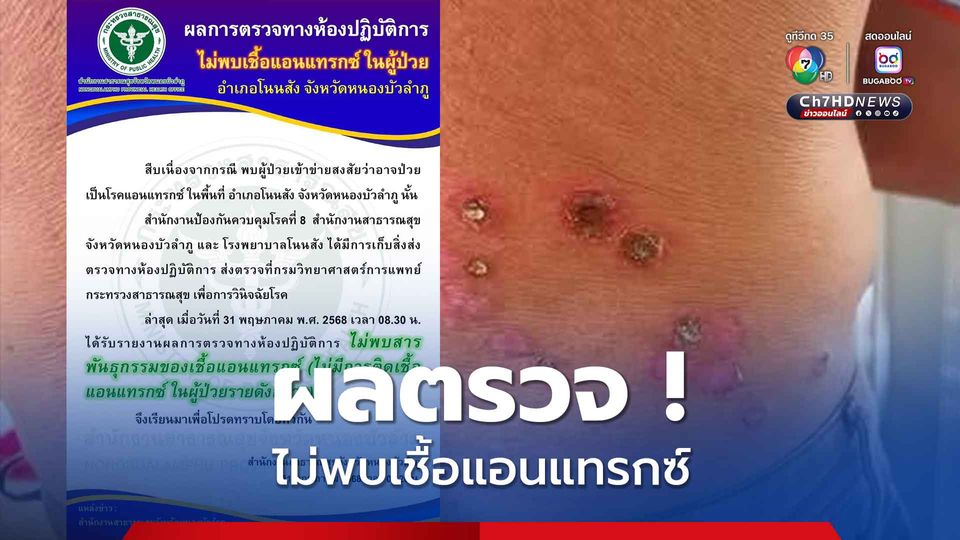 สำนักงานสาธารณสุขจังหวัดหนองบัวลำภู เผยผลการตรวจทางห้องปฏิบัติการ ไม่พบเชื้อโรคแอนแทรกซ์ ในผู้ป่วย ที่จังหวัดหนองบัวลำภู