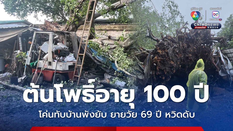 พายุฝนกระหน่ำซัดต้นโพธิ์อายุกว่า 100 ปี โค่นล้มทับบ้านพังยับทั้งหลัง ป้าวัย 69 ปี หวิดดับคาบ้าน
