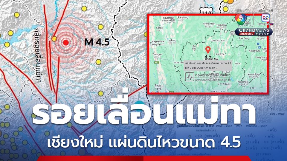 กรมทรัพยากรธรณี แจ้งว่า วันนี้ (2 มิ.ย.68) เวลา 14.07 น. เกิดแผ่นดินไหวขนาด 4.5 ที่ระดับความลึก 1 กิโลเมตร จัดเป็นแผ่นดินไหวขนาดค่อนข้างเล็ก (Light) บริเวณตำบลแม่ปั๋ง อำเภอพร้าว จังหวัดเชียงใหม่ สาเหตุเกิดจากการเลื่อนตัวของกลุ่มรอยเลื่อนแม่ทา ที่มีการวางตัวตามแนวเกือบทิศเหนือ-ใต้ มีการเลื่อนตัวแบบรอยเลื่อนปกติ (Normal fault)