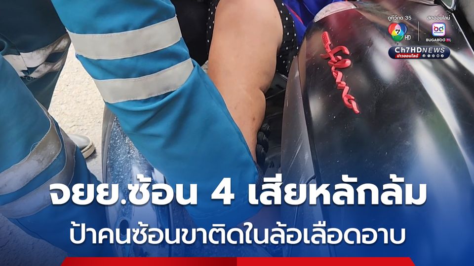 ป้าวัย 60 ขี่รถจักรยานยนต์ซ้อน 4 มีผู้ใหญ่ 2 คน และเด็กอีก 2 คน มากินก๋วยเตี๋ยว แต่ขากลับขี่รถขึ้นทางต่างระดับเกิดเสียหลักล้ม ผู้ใหญ่คนซ้อนท้ายขาเข้าไปติดในล้อรถระหว่างล้อกับท่อไอเสีย เลือดไหลโชก