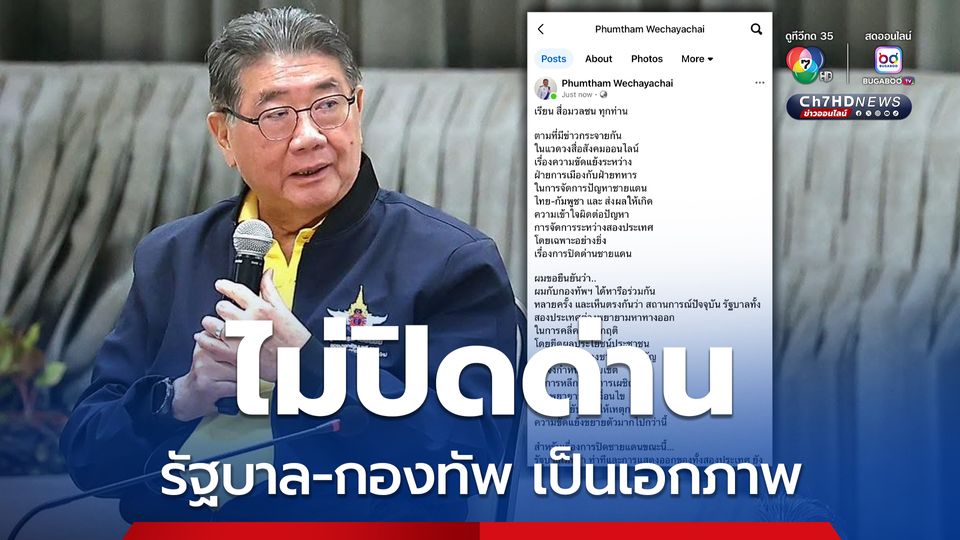 ภูมิธรรมแจงรัฐบาล-กองทัพ เป็นเอกภาพ ทั้ง 2 ประเทศ ต่างพยายามหาทางออกในการคลี่คลายวิกฤต การปิดด่านชายแดนแม้ไม่ใช่การสู้รบทางตรง แต่จะเกิดปัญหาทางเศรษฐกิจ กระทบกับวิถีชีวิตประชาชน ทำให้สถานการณ์ยากต่อการคลี่คลาย