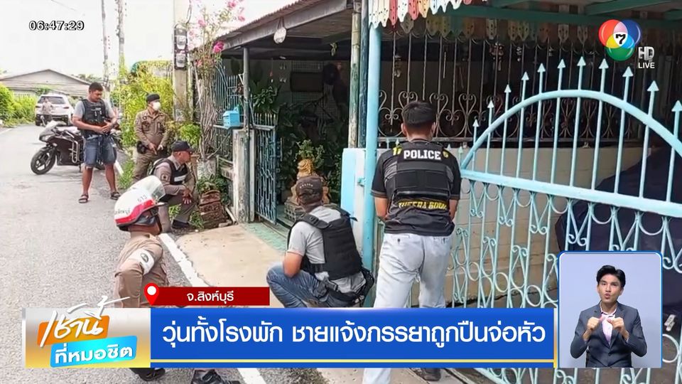 งานนี้งานใหญ่ สภ.เมืองสิงห์บุรี ระดมกำลังกันมาที่เกิดเหตุ ในพื้นที่ ตำบลต้นโพธิ์ อำเภอเมือง จังหวัดสิงห์บุรี แต่ละนายอาวุธครบมือ แม่ของนายตั้มออกจากบ้านมาพบตำรวจ เมื่อทราบว่าตำรวจมาทำไม ก็ตอบแบบงง ๆ ว่า อยู่บ้านคนเดียว ไม่มีใครอยู่ในบ้าน แต่เนื่องจากเหตุที่รับแจ้งเป็นเหตุอุกฉกรรจ์ และชายที่เป็นผู้แจ้งและมาพร้อมกับตำรวจ ก็ยืนยันว่าภรรยาถูกหลอกมา และบอกว่าถูกนายตั้มเอาปืนจ่อศีรษะอยู่ในบ้านหลังดังกล่าวให้มาช่วยจริง ๆ ตำรวจจึงต้องเข้าทำการตรวจค้นตามยุทธวิธี แต่ก็ไม่พบว่ามีบุคคลอื่นอยู่ในบ้านแต่อย่างใด จึงถอนกำลังกลับไป