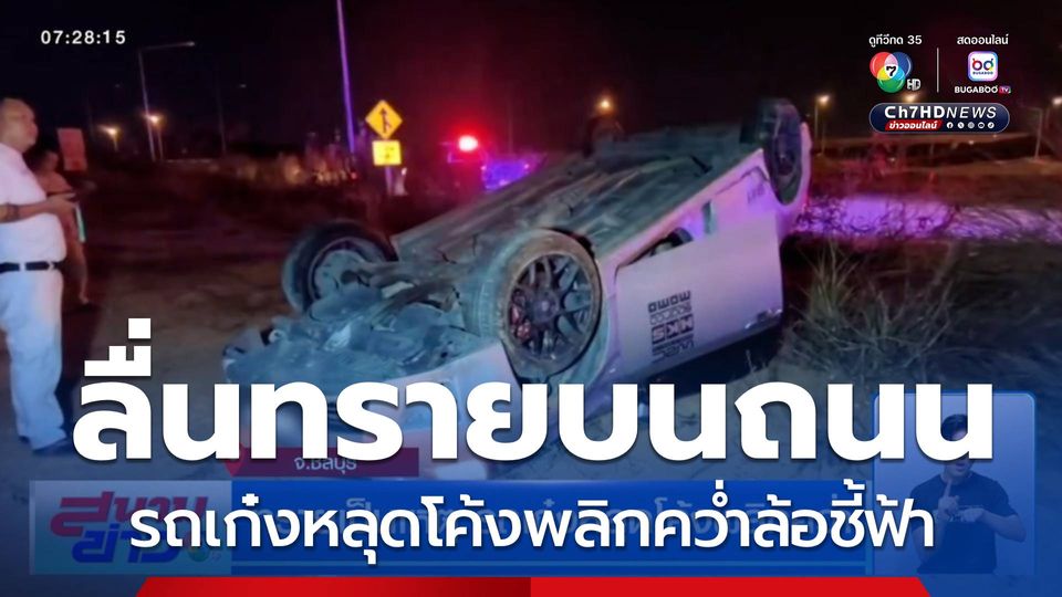 สนามข่าว 7 สี - เกิดอุบัติเหตุรถเก๋งเสียหลักหลุดโค้งพลิกคว่ำจนล้อชี้ฟ้า หลังลื่นทรายบนถนน แต่เคราะห์ยังดีไม่มีผู้เสียชีวิต