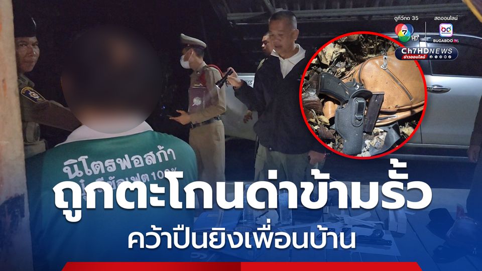 ตามรวบตัวได้ทันควัน ! เพื่อนบ้านไม่ถูกกัน ถูกตะโกนด่าข้าวรั้วขณะนั่งดื่มเหล้า คว้าปืนยิงเพื่อนบ้านได้รับบาดเจ็บ สารภาพมีปากเสียงกันมานาน