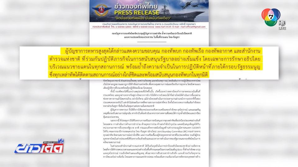 ข่าวเด็ด 7 สี - ทุกเหล่าทัพพร้อมสำนักงานตำรวจแห่งชาติ รวมใจเป็นหนึ่งในการทำงานหลังเมื่อวานประชุมผู้บัญชาการเหล่าทัพ แก้ไขปัญหาชายแดนไทย กัมพูชา