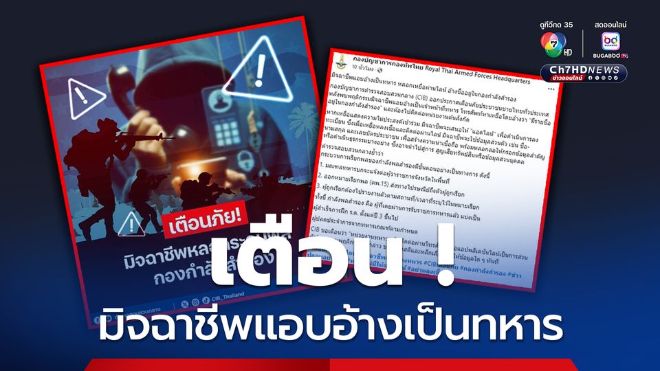 วันนี้ (8 มิ.ย.68) เพจเฟซบุ๊ก กองบัญชาการกองทัพไทย Royal Thai Armed Forces Headquarters (ศูนย์ประชาสัมพันธ์กองทัพไทย) ได้โพสต์ข้อความเตือนภัย ระบุว่า กองบัญชาการตำรวจสอบสวนกลาง (CIB) ออกประกาศเตือนภัยประชาชนชายไทยทั่วประเทศ หลังพบพฤติกรรมมิจฉาชีพแอบอ้างเป็นเจ้าหน้าที่ทหาร โทรศัพท์หาเหยื่อโดยอ้างว่า “มีรายชื่ออยู่ในกองกำลังสำรอง” และต้องไปติดต่อหน่วยงานต้นสังกัด