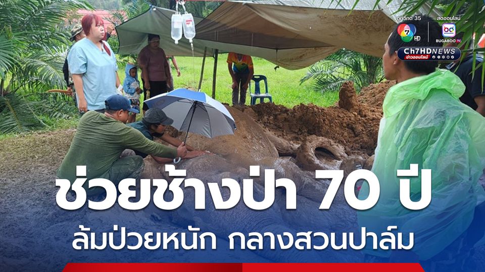 ช้างป่าชรา เพศเมีย ล้มป่วยหนัก สภาพอ่อนแรง พยุงตัวลุกขึ้นยืนเองไม่ได้ ภายในสวนปาล์มของชาวบ้าน ทางสัตวแพทย์-เจ้าหน้าที่อุทยานแห่งชาติเขาสก เข้ารักษาอย่างเร่งด่วน
