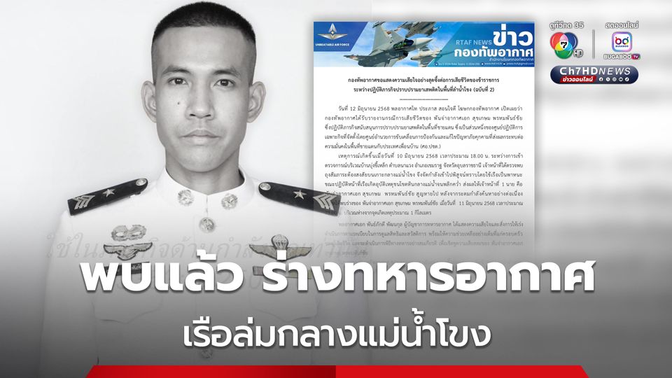 พบแล้ว! ร่างทหารอากาศ สูญหายกลางลำน้ำโขง ขณะปฏิบัติภารกิจลาดตระเวนตรวจสัมภาระต้องสงสัย ที่ บ้านบุ่งขี้เหล็ก อ.เขมราฐ จ.อุบลราชธานี โดยเรือเกิดอุบัติเหตุชนโขดหินจนล่ม เนื่องจากกระแสน้ำเชี่ยว ขณะเกิดเหตุมีทหารบนเรือ 3 นาย ว่ายขึ้นฝั่งได้ 2 นาย