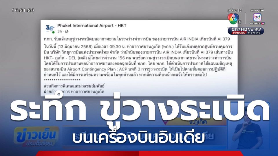ทำผู้โดยสารของสายการบินแอร์อินเดียสะเทือนขวัญ เพราะเพิ่งเจอเหตุการณ์เครื่องบินโบอิง 787 ของสายการบินแอร์อินเดียตกไปเมื่อวาน วันนี้ต้องระทึกใจอีกครั้ง เมื่อท่าอากาศยานนานาชาติภูเก็ต ได้รับแจ้งเหตุจากนักบินของสายการบินแอร์อินเดีย เที่ยวบินที่ AI 379 เส้นทางบิน ภูเก็ต-เดลี มีผู้โดยสารเดินทาง 156 คน ประสานขอนำเครื่องบินลงจอดฉุกเฉิน นักบินแจ้งว่าพบมีข้อความขู่วางระเบิดบนเครื่องบินในระหว่างทำการบิน