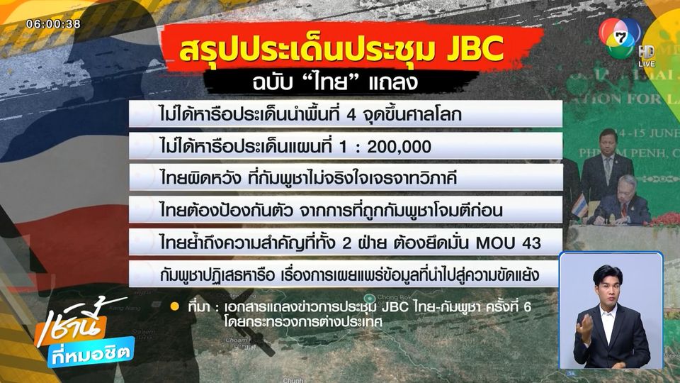 เช้านี้ที่หมอชิต - ประเด็นระหว่าง "ไทย - กัมพูชา" เดินทางมาถึงจุดหัวเลี้ยวหัวต่อสำคัญอีกครั้ง หลังจากเสร็จสิ้นการประชุม JBC ที่กรุงพนมเปญ ประเทศกัมพูชา เมื่อวาน