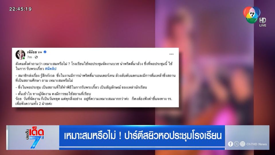 ประเด็นเด็ด 7 สี - ศิษย์เก่าโรงเรียนดังย่านบึงกุ่มรับไม่ได้ หลังเห็นหอประชุม ซึ่งเป็นที่จัดวางโต๊ะหมู่บูชา และพระเกี้ยว กลายเป็นเวทีให้แดนเซอร์โชว์ลีลา