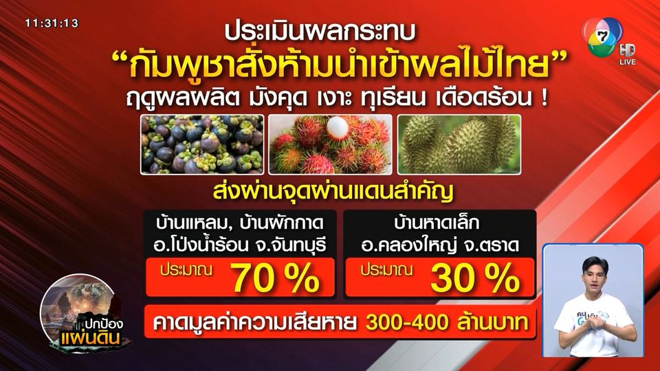 ทีมข่าวสอบถามไปที่ ผู้เชี่ยวชาญเศรษฐกิจระหว่างประเทศ ประเมินผลกระทบกัมพูชาแบนผลไม้ไทย จะอยู่ราว ๆ 300-400 ล้านบาท จากทั้งปีไทยส่งออกผลไม้ผ่านกัมพูชา มูลค่าราว 500 ล้านบาท ในช่วงฤดูออกผลผลิต มังคุด เงาะ และทุเรียนส่งออกไปเวียดนามผ่านกัมพูชา ที่จุดผ่านแดนสำคัญ คือ ที่บ้านแหลม บ้านผักกาด อำเภอโป่งน้ำร้อน จังหวัดจันทบุรี ประมาณ 70% และที่บ้านหาดเล็ก อำเภอคลองใหญ่ จังหวัดตราด 30%
