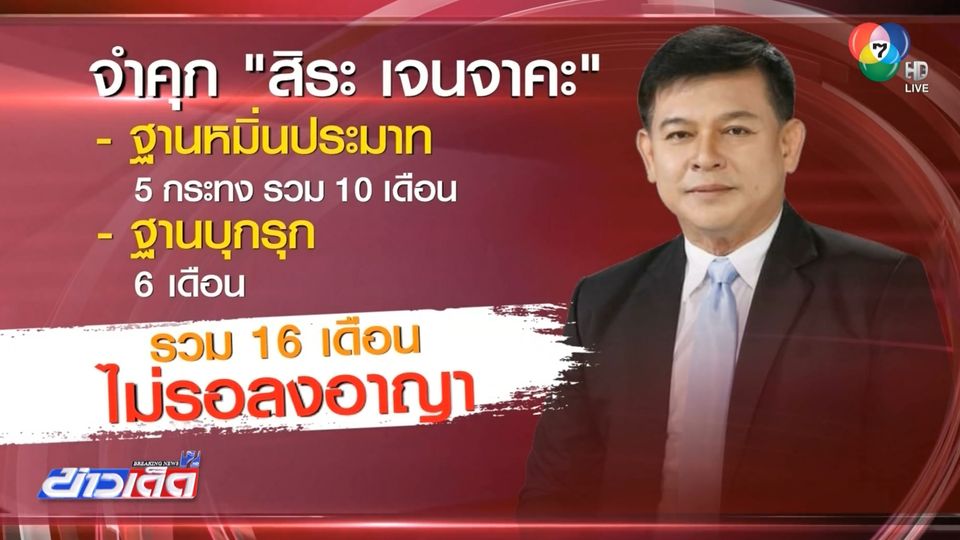 ศาลฎีกา พิพากษาจำคุก นายสิระ เจนจาคะ อดีต สส.กทม. พรรคพลังประชารัฐ เป็นเวลา 6 เดือน 20 วัน ฐานหมิ่นประมาทผู้อื่นโดยการโฆษณา และบุกรุก จากกรณีที่พาพวกรวม 5 คน บุกรุกโรงพยาบาลสนาม ว่ากล่าวใส่ความ พลตำรวจตรี นายแพทย์เหรียญทอง แน่นหนา ผอ.โรงพยาบาลมงกุฏวัฒนะ ต่อหน้าผู้อื่น และหมิ่นประมาทใส่ความผ่านทางโทรทัศน์ และสื่อออนไลน์ เหตุเกิดวันที่ 7 พฤษภาคม 2564 โดยคดีนี้ศาลชั้นต้น และชั้นอุทธรณ์ พิพากษาจำคุก 16 เดือน ไม่รอลงอาญา