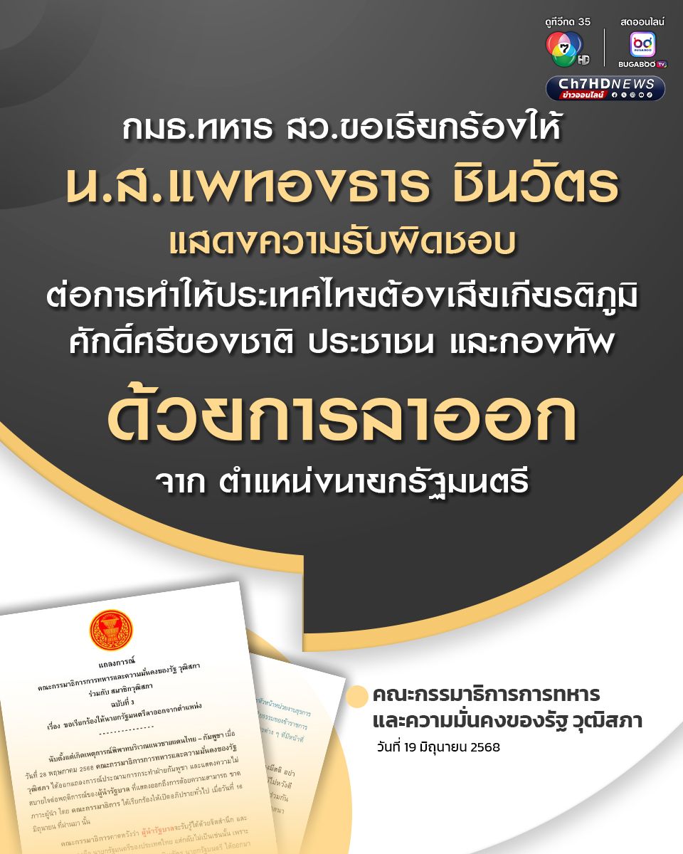 คณะกรรมาธิการ คาดหวังว่า ผู้นำรัฐบาลจะรับรู้ได้ด้วยจิตสำนึก และระลึกได้ว่า ตนเองคือ นายกรัฐมนตรีของประเทศไทย แต่กลับไม่เป็นเช่นนั้น เพราะเมื่อวานนี้ เวลา 14.30 น. นางสาวแพทองธาร ชินวัตร นายกรัฐมนตรี ได้ออกมา แถลงยอมรับว่า คลิปเสียงที่เผยแพร่ออกมานั้นเป็นคลิปเสียงของตนสนทนากับสมเด็จฮุนเซนจริง โดยมีเนื้อหาพาดพิงถึงแม่ทัพภาคที่ 2 ว่า "เป็นคนของฝ่ายตรงข้าม" รวมทั้งเป็นการด้อยค่า ไม่ให้เกียรติทหาร และกองทัพ ที่ทำหน้าที่รักษาอธิปไตย และบูรณะภาพแห่งดินแดน อีกทั้งการสนทนาเป็นลักษณะการยินยอมอ่อนข้อและอ่อนน้อม ให้กับอริราชศัตรูผู้รุกรานต่อแผ่นดินไทย โดยได้แสดงท่าที ที่พร้อมจะตอบสนองความต้องการ ที่สมเด็จฮุนเซนเรียกร้อง การกระทำของผู้นำรัฐบาลเช่นนี้ ทำให้ประเทศชาติเสียหายอย่างใหญ่หลวง และประชาชนคนไทยหมด ความเชื่อถือ ศรัทธา เพราะที่ผ่านมาพฤติการณ์ของ ผู้นำรัฐบาล ล้วนส่อไปถึง ความเป็นคนไม่รักชาติ (บ่งบอกความเป็นคนทรยศขายชาติ) บัดนี้ ความอดทนของคนในชาติ ได้สิ้นสุดลงแล้ว จากสถานการณ์ที่เกิดขึ้นจาก ผู้นำรัฐบาลที่ด้อยความสามารถ ขาดประสิทธิภาพ ขาดภาวะผู้นำ ประเทศชาติขาดความเป็นปึกแผ่น ไร้ศักดิ์ศรีและเกียรติภูติภูมิ คณะกรรมาธิการการทหารและความมั่นคงของรัฐ วุฒิสภา จึงขอเรียกร้องให้ นางสาวแพทองธาร ชินวัตร แสดงความรับผิดชอบต่อการทำให้ประเทศไทยต้องเสีย เกียรติภูมิ ศักดิ์ศรีของชาติ ประชาชน และกองทัพ ด้วยการลาออกจาก ตำแหน่งนายกรัฐมนตรี