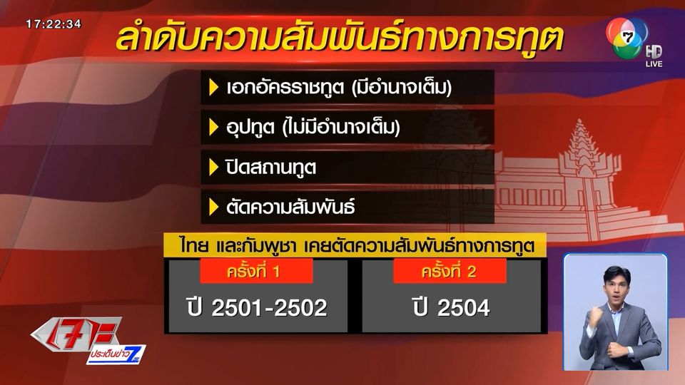 เจาะประเด็นข่าว 7HD - สถานการณ์ชายแดนไทย-กัมพูชา ที่ขณะที่ยังคงสงบเรียบร้อย แต่สถานการณ์ทางการทูต อาจจะเริ่มระส่ำ หลังมีกระแสข่าว ไทยเรียกเอกอัครราชทูตไทย ประจำกรุงพนมเปญ กลับประเทศ เพื่อลดระดับความสัมพันธ์