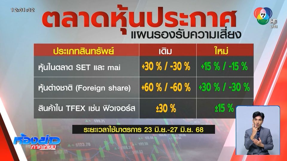 โดยปรับกรอบการซื้อขาย หรือ Ceiling & Floor ลงจาก ±30% เหลือ ±15% ลดกรอบเคลื่อนไหวของราคาซื้อ-ขายหลัก หรือ Dynamic Price Band จาก ±10% เหลือ ±5% จากราคาล่าสุดของแต่ละหลักทรัพย์ โดยมาตรการนี้บังคับใช้ชั่วคราวตั้งแต่ 23-27 มิถุนายน 2568