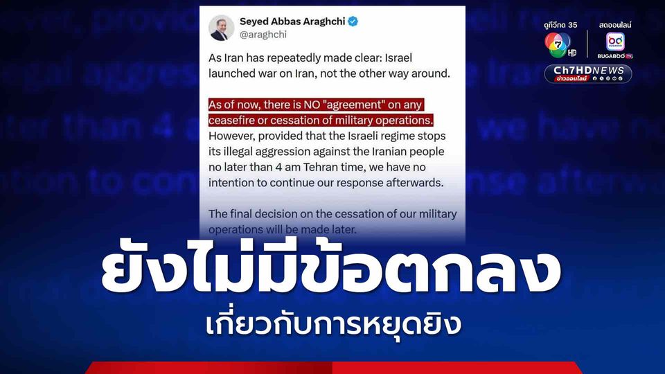 วันนี้ (24 มิ.ย. 68) มีรายงานว่า นายอับบาส อารักชี รัฐมนตรีต่างประเทศของอิหร่าน ได้โพสต์ข้อความบน X ว่า ณ เวลาขณะนี้ ไม่มีข้อตกลงการหยุดยิง หรือการยุติปฏิบัติการทางทหารใด ๆ