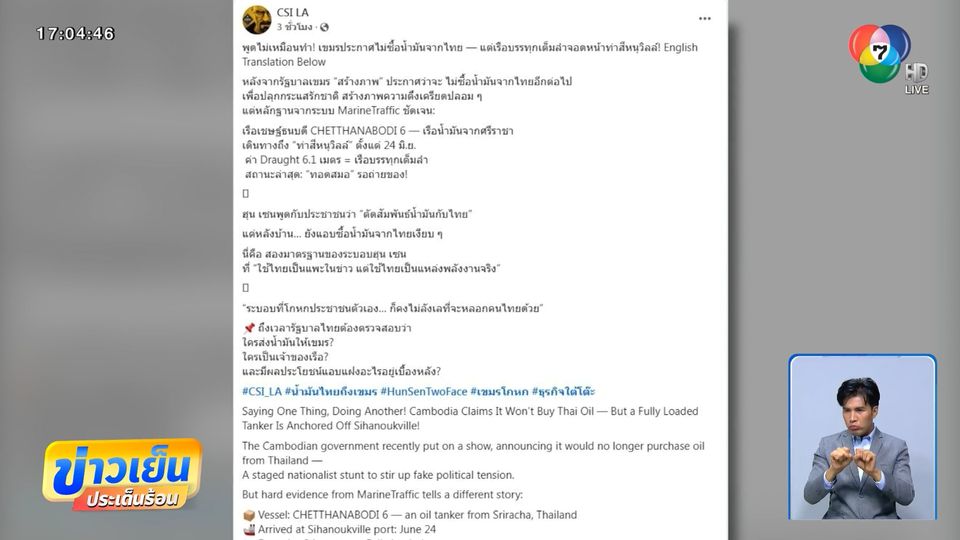 ข่าวเย็นประเด็นร้อน - มีเพจดัง ออกมาแฉกัมพูชา พูดอีกอย่าง ทำอีกอย่าง สั่งไม่นำเข้าน้ำมันไทย แต่กลับพบมีเรือขนน้ำมันจากศรีราชาโผล่ท่าสีหนุวิลล์