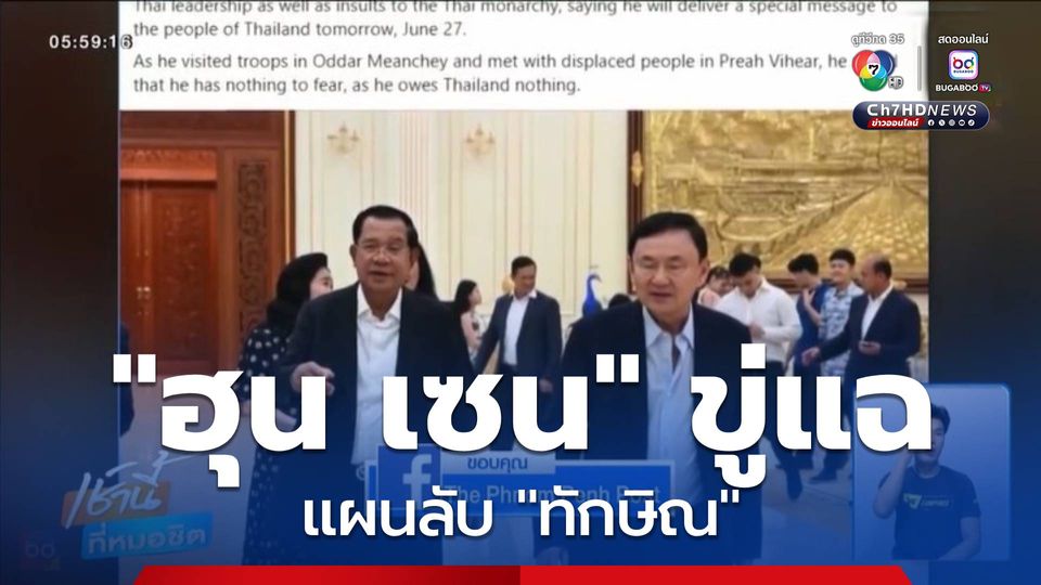 เช้านี้ที่หมอชิต - จับตาการเปิดเผยข้อมูลจาก "สมเด็จฯ ฮุน เซน" หลังมีข่าวอ้างว่าจะเผยแผนการของ "อดีตนายกฯ ทักษิณ" ซึ่งอ้างว่าเกี่ยวข้องกับการเปลี่ยนตัวผู้นำประเทศไทย