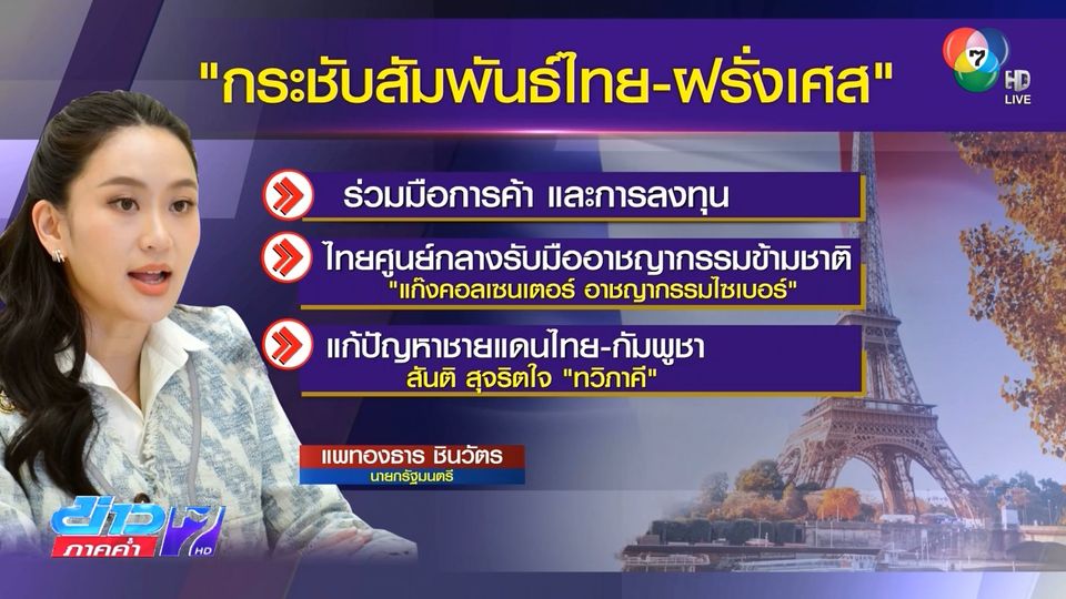 นางสาวแพทองธาร ชินวัตร นายกรัฐมนตรี หารือทางโทรศัพท์กับ นายเอมานูว์แอล มาครง ประธานาธิบดีสาธารณรัฐฝรั่งเศส ร่วมมือกันมากขึ้นในเรื่องการค้าและการลงทุน และในมิติอาเซียน เป็นศูนย์กลางรับมืออาชญากรรมข้ามชาติ ที่ฝรั่งเศสพร้อมสนับสนุน สำหรับสถานการณ์ชายแดนไทย-กัมพูชา นายกรัฐมนตรี ย้ำแก้ไขปัญหาอย่างสันติ ด้วยความสุจริตใจ บนพื้นฐานของความเป็นมิตรที่ดี และหลักกฎหมายระหว่างประเทศ เจรจาในกรอบทวิภาคีคือแนวทางที่มีประสิทธิภาพที่สุด หวังว่าฝรั่งเศสในฐานะหุ้นส่วนระหว่างประเทศที่ใกล้ชิด จะสนับสนุนต่อการเจรจาทวิภาคี ให้กลับมาดำเนินต่อไปด้วยดี ซึ่งประธานาธิบดีฝรั่งเศส รับทราบเจตนารมณ์ของไทย และจะพิจารณานำไปประสานความร่วมมือกับกัมพูชาต่อไป