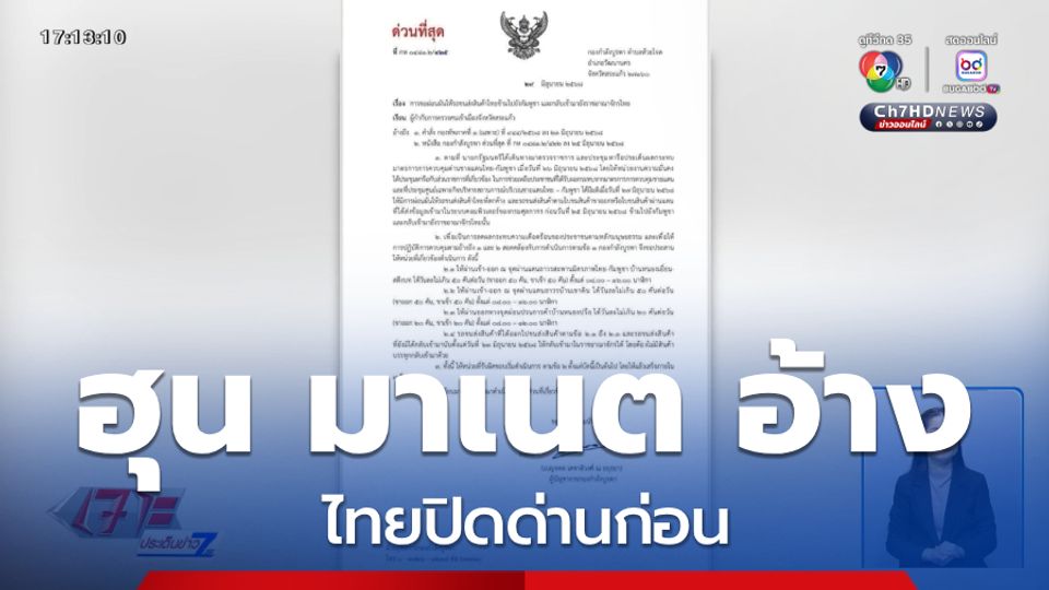 เจาะประเด็นข่าว 7HD - ผู้นำกัมพูชา เผย เจ้าหน้าที่กัมพูชาได้รับหนังสือจากฝั่งไทยในจังหวัดสระแก้ว ขอเปิดประตูชายแดนไทย-กัมพูชา บางส่วน และให้รถบรรทุกเข้า-ออกแล้ว อ้างว่าไทยเป็นฝ่ายปิดด่านก่อน ฝ่ายกัมพูชาไม่ได้ทำ