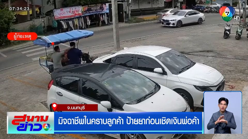 สนามข่าว 7 สี - เหลือบไรสังคมก่อกวนคนทำมาหากินสุจริตไม่หมดสักที เมื่อพ่อค้าผลไม้ ย่านนนทบุรี ขายของอยู่ดี ๆ แต่ก็มีมิจฉาชีพในคราบลูกค้า ทำทีสั่งผลไม้ ก่อนตีเนียนเข้ามาป้ายยาแล้วขอเงินสดไปดื้อ ๆ
