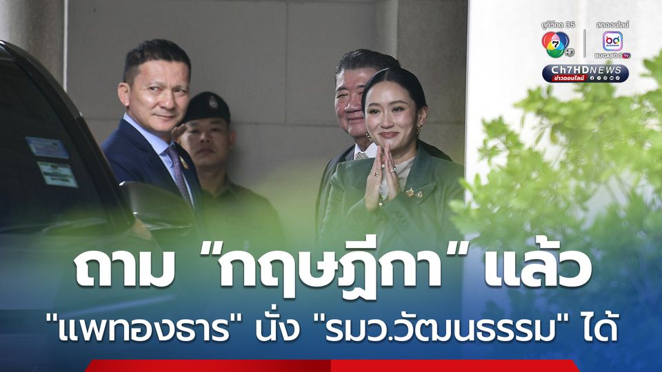 วันนี้ (2ก.ค.68) นายภูมิธรรม เวชยชัย รองนายกรัฐมนตรี และ รัฐมนตรีว่าการกระทรวงมหาดไทย ยืนยันว่า นางสาวแพทองธาร ชินวัตร นายกรัฐมนตรี เข้าถวายสัตย์ปฏิญาณ เพื่อรับตำแหน่งรัฐมนตรีว่าการกระทรวงวัฒนธรรมในวันที่ 3 กรกฎาคมนี้ได้ แม้ศาลรัฐธรรมนูญ สั่งให้หยุดปฏิบัติหน้าที่นายกรัฐมนตรี เพราะนายชูศักดิ์ ศิรินิล รัฐมนตรีประจำสำนักนายกรัฐมนตรี ได้ปรึกษากับเลขาธิการคณะกรรมการกฤษฏีกาแล้ว
