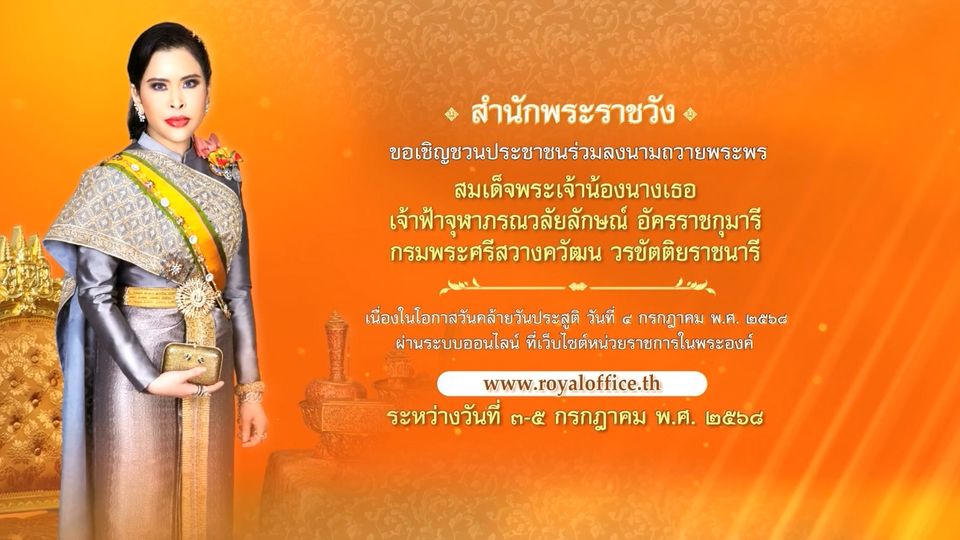 สำนักพระราชวัง ขอเชิญชวนประชาชน ร่วมลงนามถวายพระพร สมเด็จพระเจ้าน้องนางเธอ เจ้าฟ้าจุฬาภรณวลัยลักษณ์ อัครราชกุมารี กรมพระศรีสวางควัฒน วรขัตติยราชนารี เนื่องในโอกาสวันคล้ายวันประสูติ วันที่ 4 กรกฎาคม 2568 ผ่านระบบออนไลน์ ที่เว็บไซต์หน่วยราชการในพระองค์ ระหว่างวันที่ 3-5 กรกฎาคม 2568