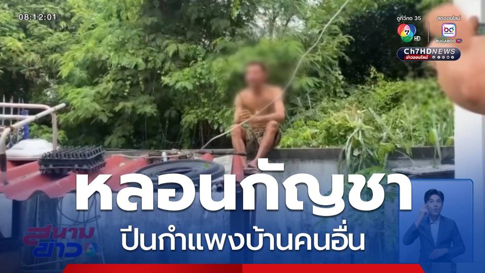 สนามข่าว 7 สี - ที่จังหวัดชลบุรี ชายพี้กัญชาจนหลอน อ้างโดนของเขมร ปีนขึ้นไปยืนบนขอบกำแพงบ้านของชาวบ้าน แถมไม่ได้ยืนเฉย ๆ ยืนทำอะไร ไปดู