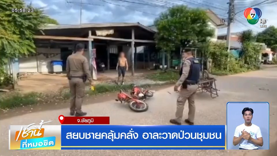 เช้านี้ที่หมอชิต - ที่จังหวัดชัยภูมิ มีเหตุให้ชาวบ้านต้องผวา หลังจากชายคลุ้มคลั่งอาละวาดในชุมชน ต้องแจ้งตำรวจมาช่วยเหลือ