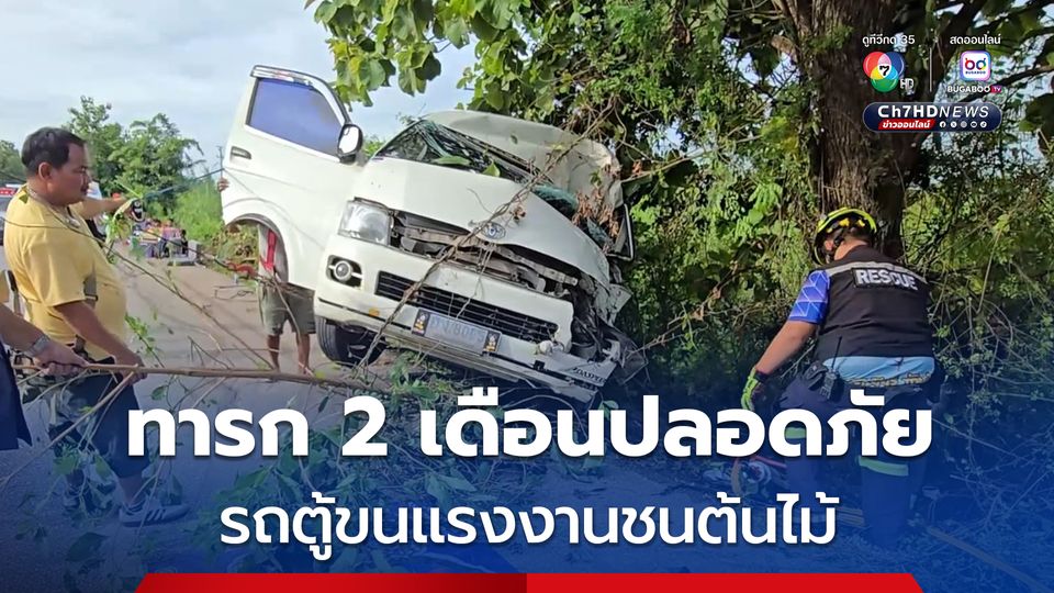 อุบัติเหตุรถตู้ขนแรงงานเมียนมา ชนต้นไม้ข้างทาง เคราะห์ดีทารก 2 เดือนอยู่ในอ้อมอกแม่ปลอดภัย บาดเจ็บเล็กน้อย 9 คน สาหัส 1 คน