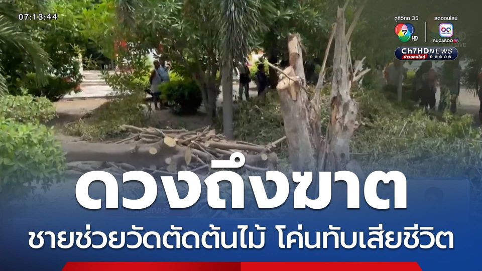 สนามข่าว 7 สี - อุทาหรณ์นำมาเตือน ใครต้องขึ้นต้นไม้สูง ๆ ตัดแต่งกิ่ง ต้องระวังให้มาก ชายอายุ 64 ปี ถึงคราวเคราะห์ไปช่วยวัดตัดต้นไม้ แต่พลาดถูกกิ่งไม้ใหญ่ร่วงทับเสียชีวิต