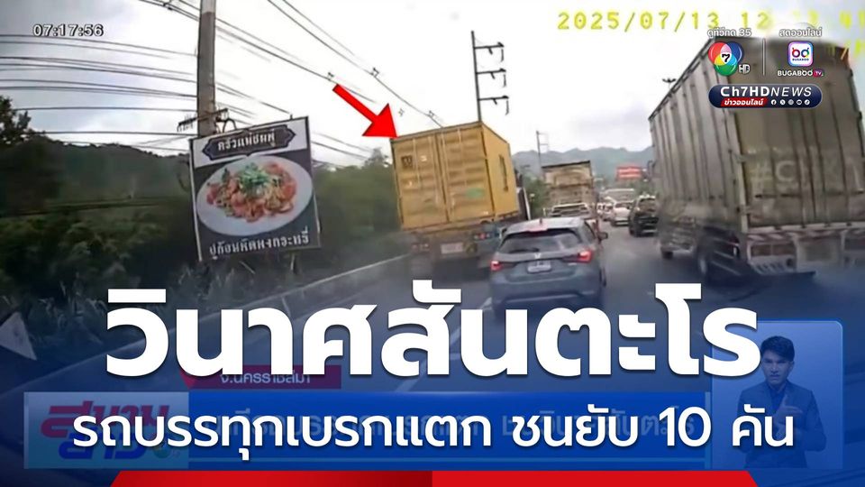 สนามข่าว 7 สี - เมื่อวาน เกิดเหตุระทึกบนถนนมิตรภาพ รถบรรทุกตู้คอนเนอร์เสียหลักพุ่งชนรถเสียหาย 10 คัน