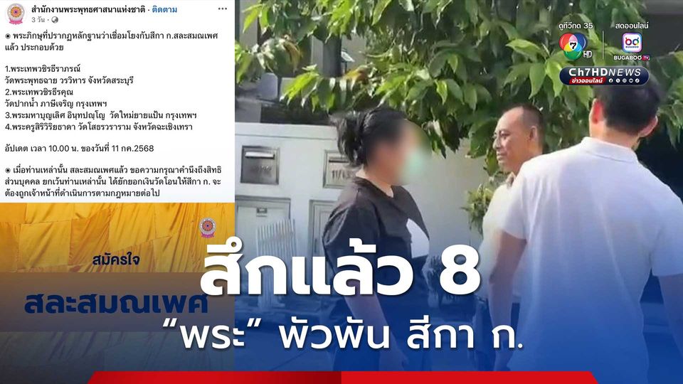 สำนักงานพระพุทธศาสนาแห่งชาติ อัปเดตผ่านเพจเฟซบุ๊ก ล่าสุด พระชั้นผู้ใหญ่ ที่พัวพัน สีกา ก. ยอมสึก และสละสมณะเพศแล้ว 8 รูป