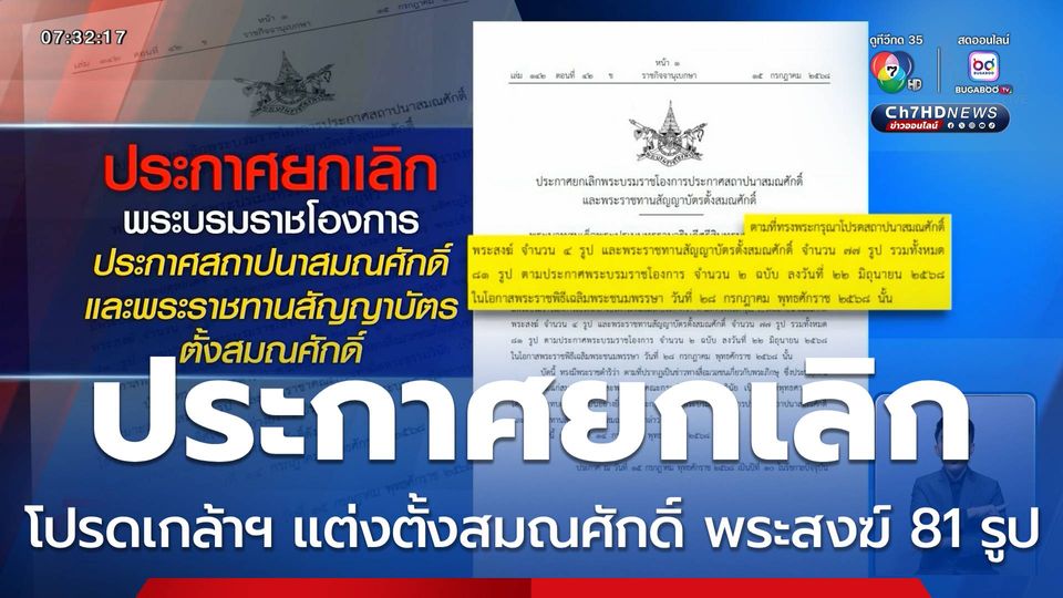สนามข่าว 7 สี - ประกาศยกเลิกพระบรมราชโองการ สถาปนาสมณศักดิ์ และพระราชทานสัญญาบัตรตั้งสมณศักดิ์ 81 รูป