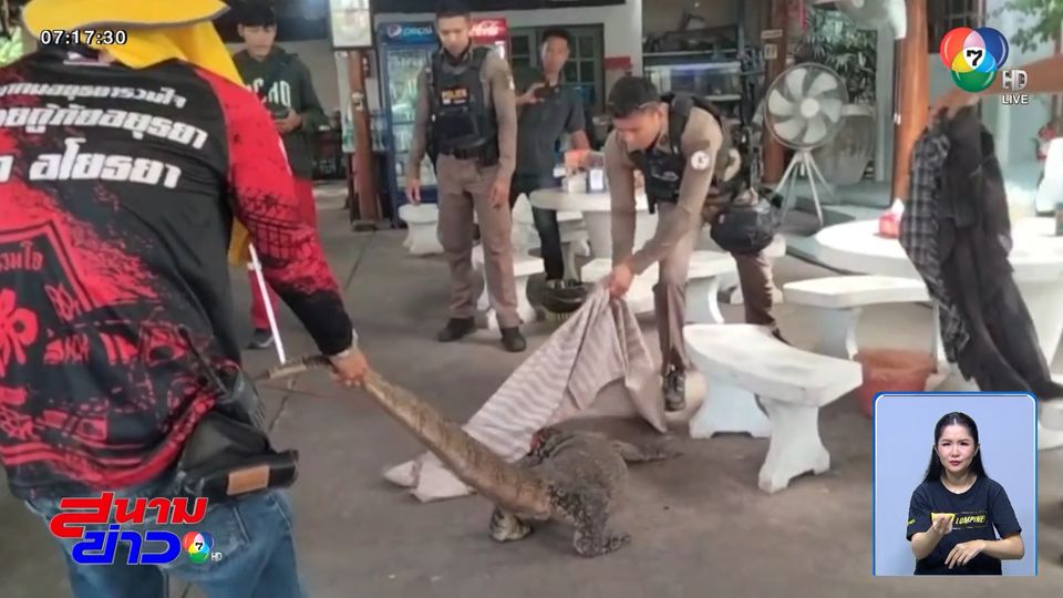 ภาพนาทีเจ้าหน้าที่ตำรวจ พร้อมกู้ภัย กำลังช่วยกันจับผู้ร้ายคือ "ตัวเงินตัวทอง" ขนาดใหญ่ถึง 3 เมตร บุกเข้ามาในร้านก๋วยเตี๋ยว ที่ตำบลประตูชัย อำเภอพระนครศรีอยุธยา จังหวัดพระนครศรีอยุธยา ซึ่งตำรวจใช้ไม้ง่ามจับอย่างทุลักทุเล และพยายามใช้ผ้าปิดตาตัวเงินตัวทองไว้ ก่อนกระโดดเข้าไปนั่งทับกลางตัว แต่ค่อนข้างลำบาก เพราะถูกขู่ตลอดเวลา แถมมีความดุร้าย ใช้เวลาปลุกปล้ำประมาณ 30 นาที จึงสามารถจับได้ ก่อนจะนำไปปล่อยคืนสู่ธรรมชาติ