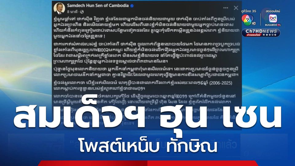สมเด็จฯ ฮุน เซน ประธานวุฒิสภาและอดีตนายกรัฐมนตรีกัมพูชา โพสต์ข้อความตอบโต้นายทักษิณ ชินวัตร ระบุว่า ตนเองต่างหากที่ไม่ต้องการพุดคุยกับทักษิณ หลังจากถูกนางสาวแพทองธารพูดจาเหยียดยาม และ ตนไม่ต้องการพูดคุยกับผู้ที่มีประวัติอาชญากรรม และเตรียมถูกดำเนินคดีเพิ่ม หากบอกว่าตนขาดศีลธรรม ทำไมถึงพึ่งพาตนมาตลอด 19 ปี และยังเรียกตนว่าผู้นำหมายเลข 1 และนโยบาย "ทักษิณคิด เพื่อไทยทำ" ที่จริงแล้วเป็นทฤษฎีของฮุนเซน และข้อกล่าวหาที่ว่านายทักษิณเป็นหัวหน้าพรรคเพื่อไทยตัวจริงเป็นเรื่องจริง รวมทั้งการหักหลังพรรคภูมิใจไทย ก็เป็นความคิดของทักษิณ ไม่ใช่ของ นางสาวแพทองธาร