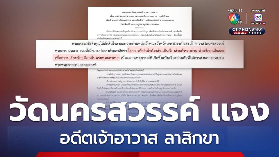 ข่าวเด็ด 7 สี - วัดนครสวรรค์ พระอารามหลวง ออกแถลงการณ์ แจง ปม "อดีตพระธรรมวชิรธีรคุณ" ลาออกจากตำแหน่ง และลาสิกขา เป็นเรื่องส่วนตัว