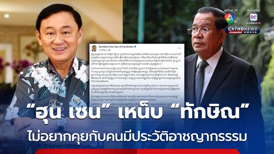 “สมเด็จฯ ฮุน เซน” โพสต์เหน็บ "ทักษิณ ชินวัตร" ไม่อยากคุยกับคนมีประวัติอาชญากรรรม และอ้างเป็นคนคิดนโยบาย "ทักษิณคิด เพื่อไทยทำ" แถมเผยว่า “ทักษิณ” เรียก “ฮุน เซน” ว่าผู้นำหมายเลข 1