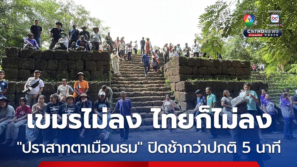 “ปราสาทตาเมือนธม” ต้องปิดช้ากว่าปกติ 5 นาที เนื่องจากนักท่องเที่ยวกัมพูชายังไม่ลงจากปราสาท ทำให้นักท่องเที่ยวไทยก็ไม่ยอมลงเหมือนกัน ทางเจ้าหน้าที่ทั้งสองฝั่งจึงต้องใช้เวลาในการระบายคนออก