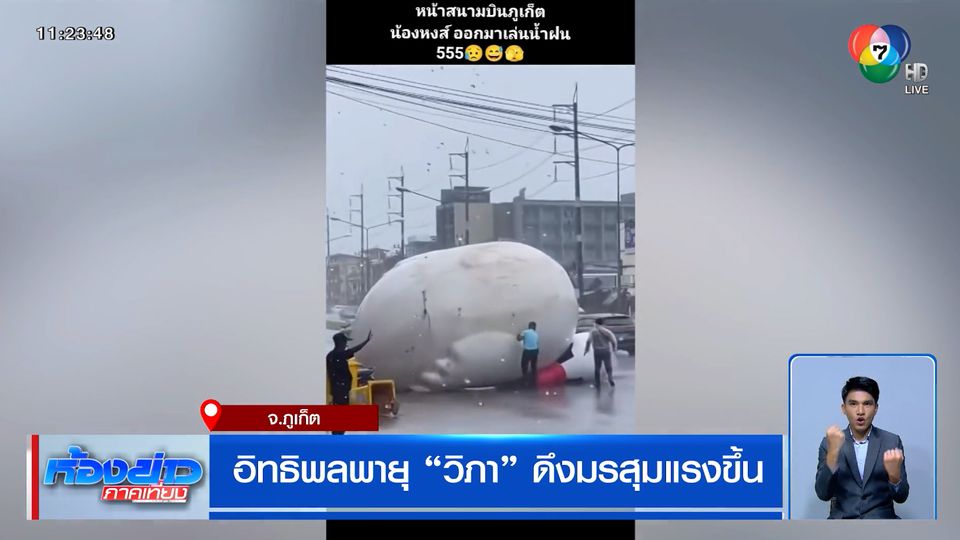 อีกคนเจอตุ๊กตาเป่าลม รูปหงษ์ยักษ์ ปลิวขวางทางบริเวณแยกไฟแดงสนามบินภูเก็ต ผู้ขับขี่เหยียบเบรกกันตัวโก่ง ก่อนจะมีคนมาช่วยลากหงษ์ยักษ์ออกจากถนน