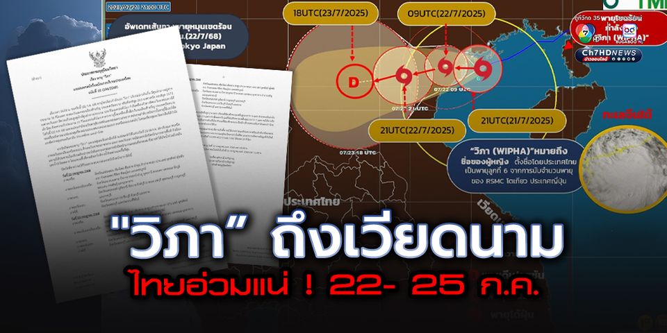 กรมอุตุนิยมวิทยา ประกาศฉบับที่ 10 อัปเดตพายุโซนร้อนกำลังแรง "วิภา(WIPHA)" เวลา 04.00 น. เช้าวันนี้ (22 ก.ค.68) มีศูนย์กลางอยู่ห่างประมาณ 50 กิโลเมตร ทางตะวันออกของเมืองท้ายบิ่ญ ประเทศเวียดนาม กำลังเคลื่อนตัวทางทิศตะวันตกค่อนทางใต้เล็กน้อย ด้วยความเร็วประมาณ 15 กิโลเมตรต่อชั่วโมง คาดว่าพายุนี้จะเคลื่อนขึ้นฝั่งบริเวณเมืองนี้ ในช่วงสายวันนี้ (22 ก.ค. 68) และจะอ่อนกำลังลงเป็นพายุดีเปรสชันและหย่อมความกดอากาศต่ำตามลำดับ