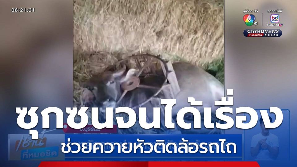 เช้านี้ที่หมอชิต - ทั้งสงสารและขำ “เจ้าสมหวัง” ควายตัวเมีย อายุ 2 ปี ไม่รู้ซุกซนท่าไหน หัวเข้าไปติดล้อรถไถนา เอาออกเองไม่ได้