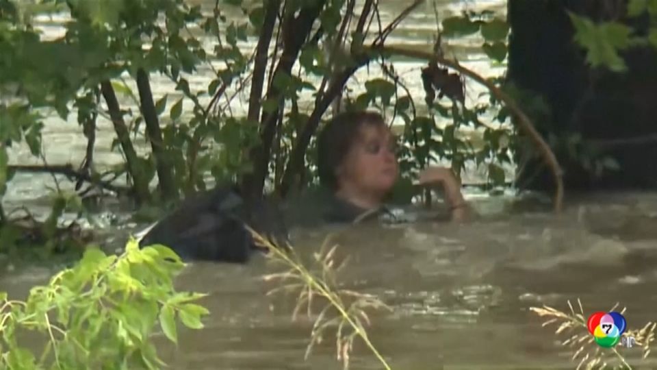 ฝนตกหนักทำให้เกิดเหตุน้ำท่วมฉับพลันในเมืองแคนซัสซิตี ของสหรัฐฯ เจ้าหน้ที่ต้องช่วยเหลือหญิงคนหนึ่งที่ติดอยู่กลางกระแสน้ำเชี่ยว