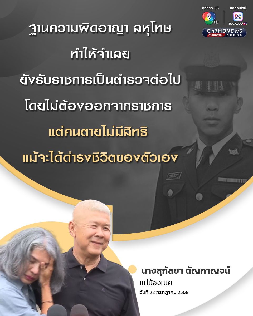 แม่น้องเมย เปิดใจหลังศาลทหารชั้นฎีกา พิพากษาจำคุกรุ่นพี่เตรียมทหารทำ “น้องเมย” เสียชีวิต เผย จำเลย ยังรับราชการเป็นตำรวจต่อไป โดยไม่ต้องออกจากราชการ แต่คนตายไม่มีสิทธิ แม้จะจะได้ดำรงชีวิตของตัวเอง